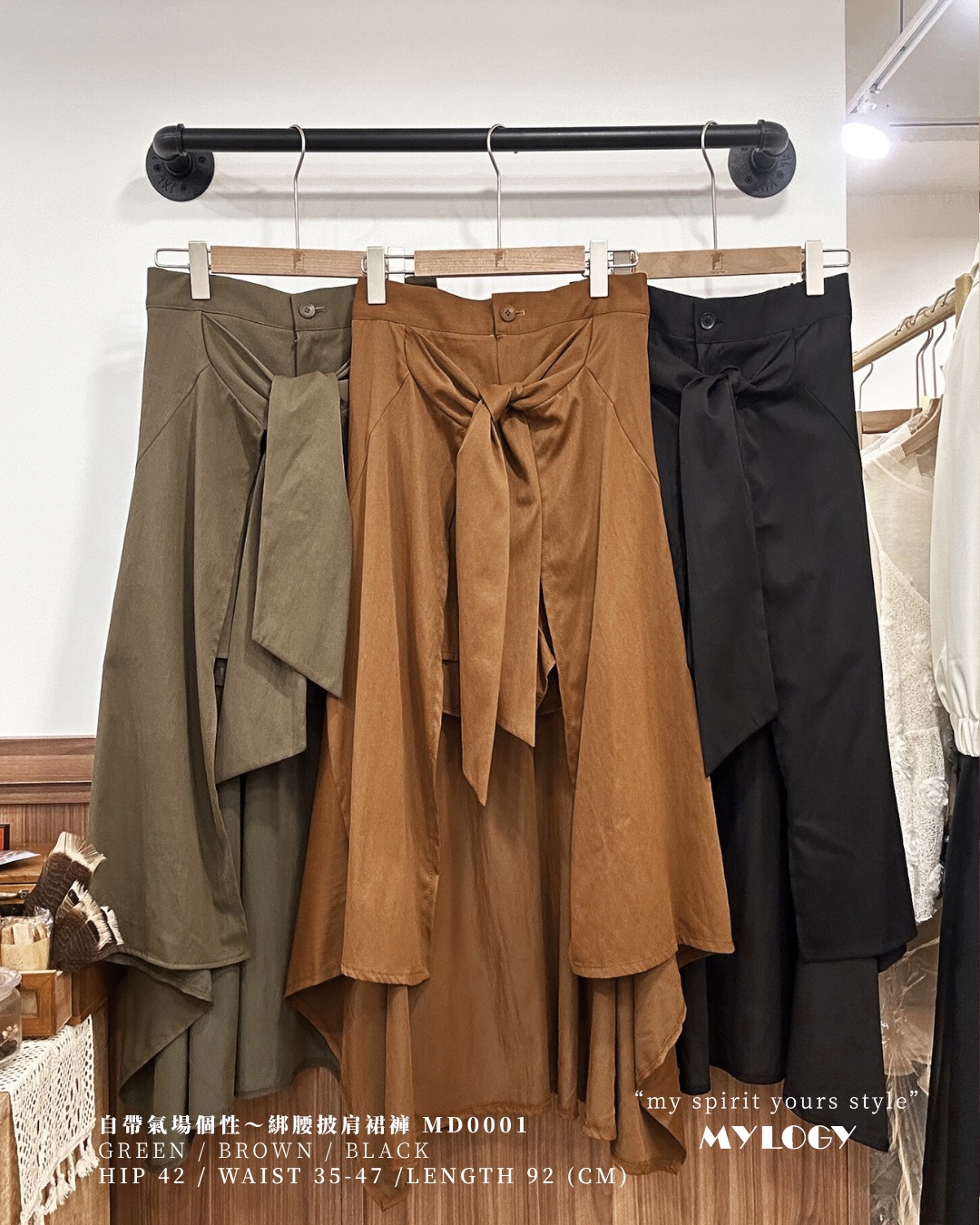 自帶氣場個性~綁腰披肩裙褲 MD0001 Color: Brown / Khaki Green / Black Size: Free Size 呎吋cm 腰闊:35-47 | 臀部 : 42 長度:92|跨下 : 32 | 褲管 : 38 *所有商品均為人手量度呎吋,有機會出現1-3cm誤差。 Misslogy: 👩🏻🦰Winki 160cm, M size ,, 現貨發貨日: 2-3個天作天內 一般訂貨截單日為每月7&20號❤️ 到貨日為截單後1~3星期內發貨。 如有特別業務狀況,亦會即時在ig fb story內發放 ʟᴏᴠᴇ~ 感謝各位girls嘅耐心等候!